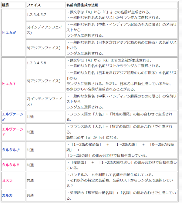 つまり各種族毎の自動生成名は以下のように決定されているようだ。